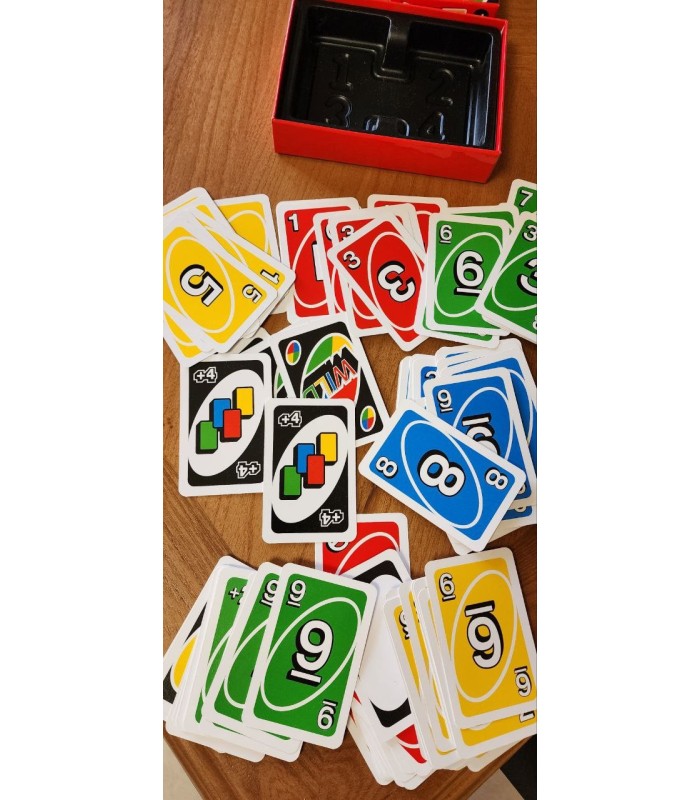 این جعبه شامل نسخهی کلاسیک (original) بازیِ «اونو» (108 کارتی) به علاوهی ۱۲ کارت عملیاتی جدید میباشد که شما به صورت دلخواه میتونین هر تعدادی از این ۱۲ کارت عملیاتی رو به کارتها اضافه و بازی کنین.